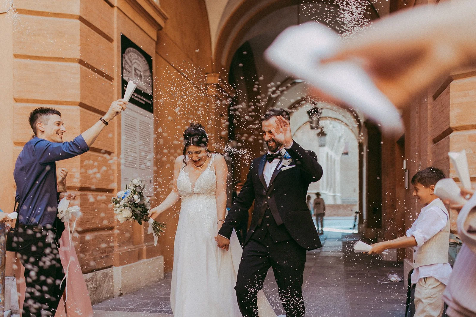 Dopo i preparativi hanno scelto il Ridotto del Teatro di Ferrara per lo scambio delle promesse. Gli stucchi dorati sormontati da enormi lampadati in cristallo si sono prestati perfettamente ad ospitare il caloroso benvenuto agli sposi da parte degli invitati, così come i saluti del dopo cerimonia.